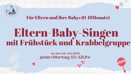 Ab dem 16. Juni bietet Mareike Haley (Mitarbeiterin für Kinder, Familien und Jugendliche) wöchentlich jeden Montag von 10-12Uhr ein Eltern-Baby-Singen mit anschließender Krabbelgruppe und Frühstück an.